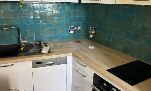 Rénovation en cours d'une cuisine sur collioure avec pose d'une nouvelle faïence.